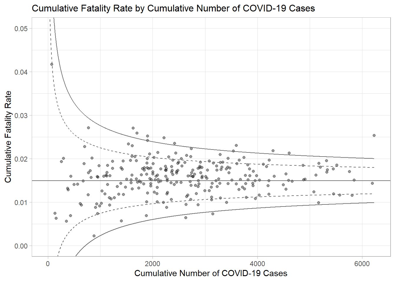 ggtitle("Cumulative Fatality Rate by Cumulative Number of COVID-19 Cases") +